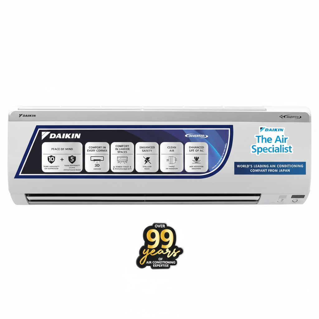 Daikin FTKL Series 1 Ton inverter split air conditioner with R32 refrigerant and high ambient cooling.